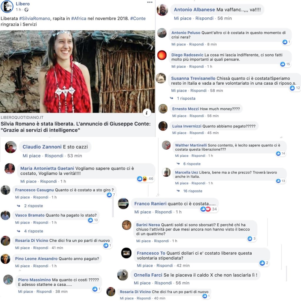 in ultimo, la vergogna: Silvia percepita come un costo, un costo eccessivo, sottratto ancora una volta agli italiani onesti, gli italiani che lavorano: quasi sempre bianchi, quasi sempre agiati, quasi sempre moderatamente razzisti, quasi sempre pronti alla battuta sessista, e anche in questo caso, loquaci in modo fastidioso, gli idioti.