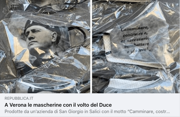 Ci stiamo, è bene dirlo, rompendo le palle di questi cavernicoli. La novità sono le mascherine del duce, e si potrebbe pensare: buon pro gli faccia, ma è più complicato di così. Oggi bisogna stare attenti alle copertine usate dalla stampa. Bisogna stare attenti alle condivisioni sdegnose, perché per ogni condivisione una platea silenziosa si attiva, pensa, elabora concetti, non sempre quelli che la costituzione prevede.